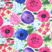 絵の具で描かれたようなカラフルで愛らしい花が生地いっぱいに広がり、まるでお花畑のよう。全体的にメリハリのある大胆な色彩も斬新です。