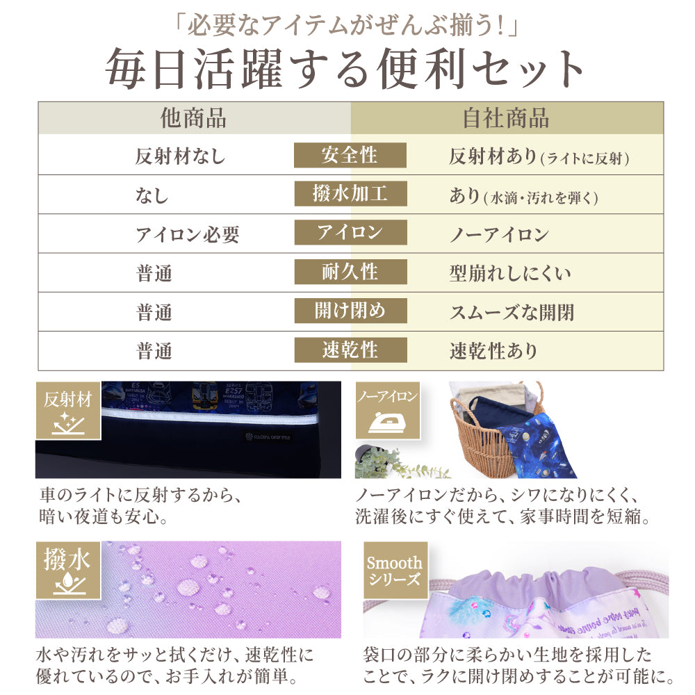 COLORFUL CANDY STYLE3 reviews>>女の子向け人気柄はこちら<<入園入学セット [2026春モデル] 撥水軽量タイプ5点セット内容 【2タイプ選択】マチありタイプ(2026春モデル):1.マチ付きキルティングレッスンバッグ反射材が車のライトをしっかり返すので、夕暮れのおけいこ帰りも安心です。一般的な大きさのお道具箱(幅約23...
