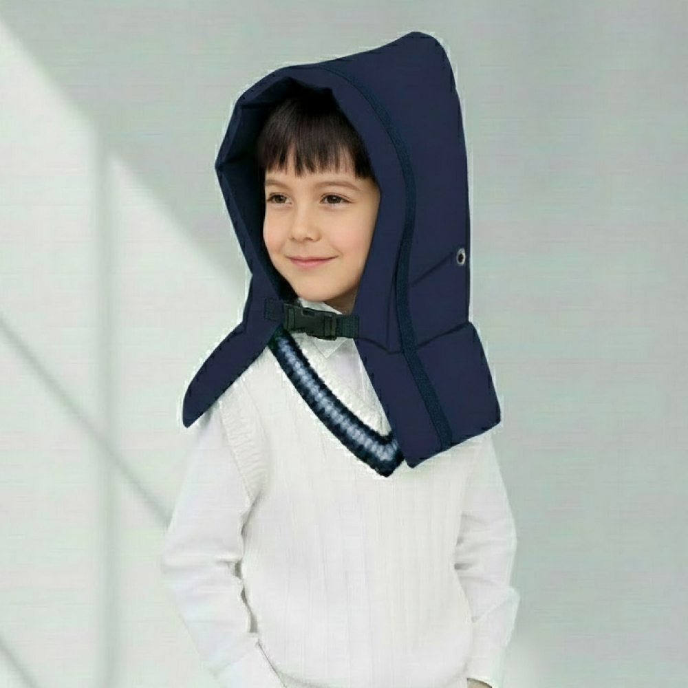 分厚い中綿クッションが子どもの首・肩まで覆って保護。頭を衝撃からしっかりと守ります。