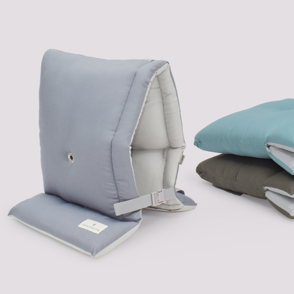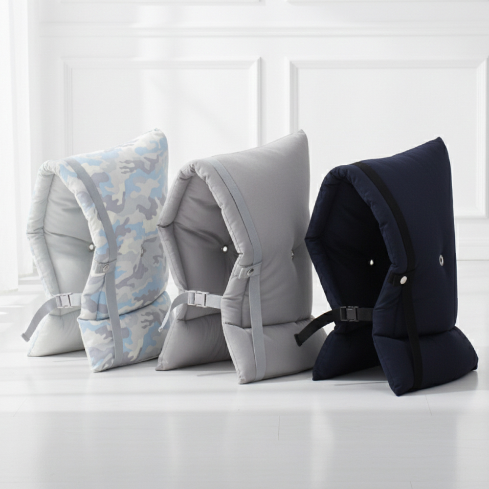 防災頭巾カバーを使えば椅子の背もたれにも取り付け可能。もちろん座布団としても収納できます。