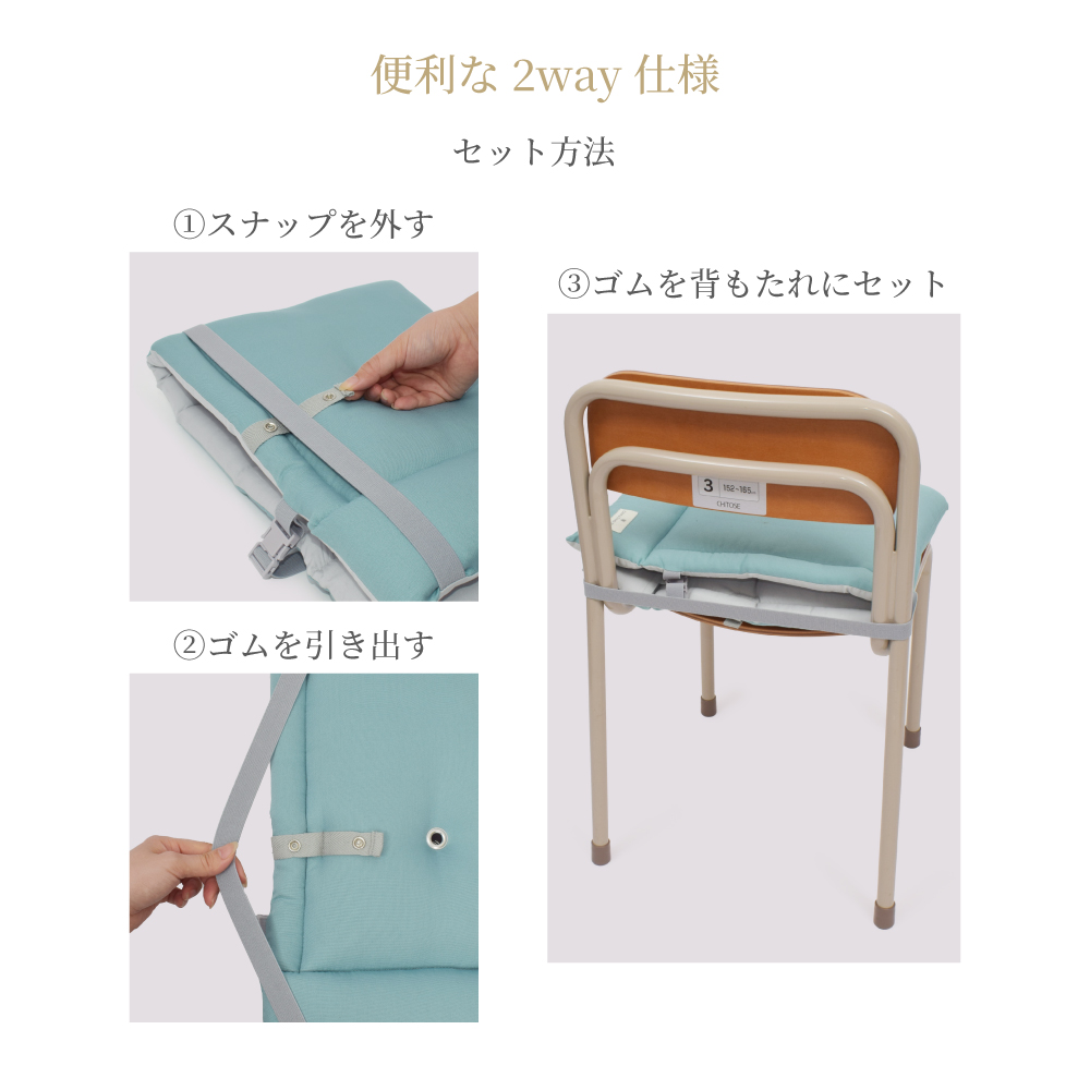 サイズ・仕様は園児~小学校高学年まで対応。ゴムを椅子にかければこれ一つで座布団としてセットOK。
