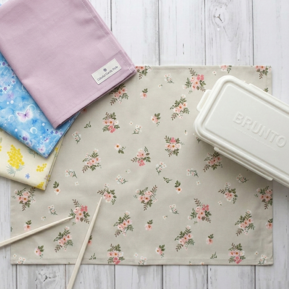 用途いろいろ、正方形タイプのランチクロス。給食トレーや食器の下に敷ける大きめサイズ。ランチボックスやコップ、スプーンも並べられます。(サイズ:タテ45cm×ヨコ45cm)