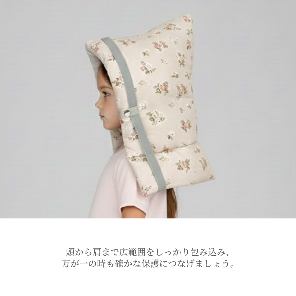 分厚い中綿クッションが子どもの首・肩まで覆って保護。頭を衝撃からしっかりと守ります。