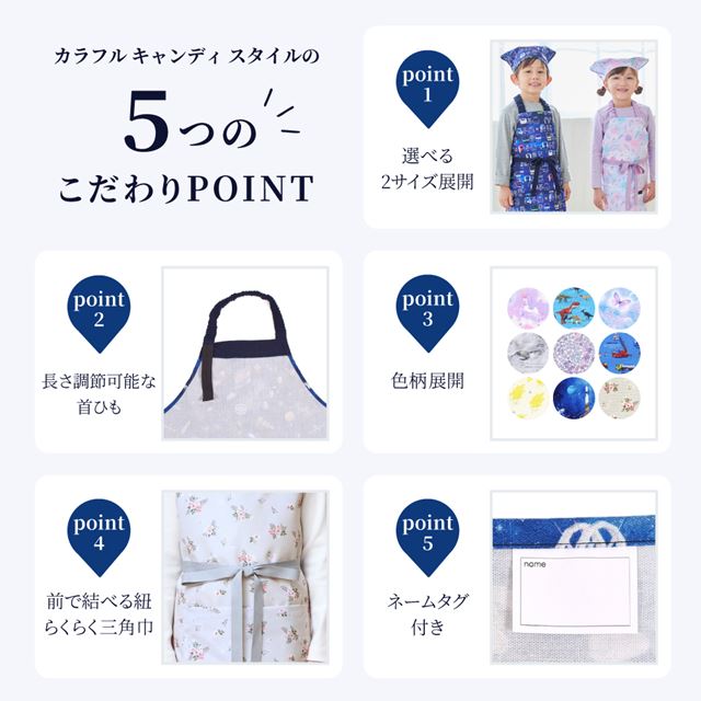 首ひもの長さを調節できるので、丈の長さを子どもの身長に合わせて変更可能。長くご愛用いただけます。