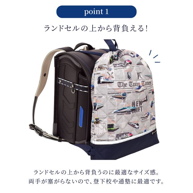 3.リュックにも手提げにも使える2WAY仕様で、ランドセルの上からも背負えます