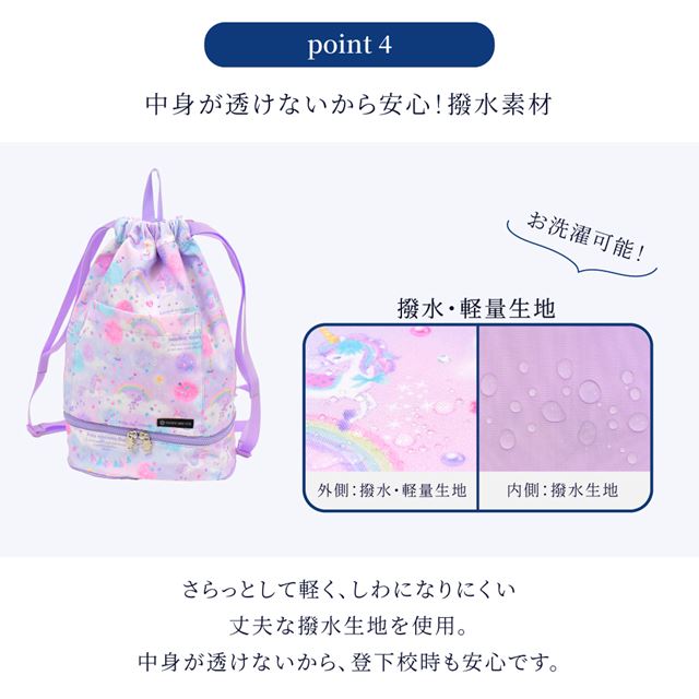 2.快適さと機能性を備えた、キッズのライフスタイルの必需品。自由な動きを楽しむ2重底構造のプールバッグナップサックタイプ新登場!